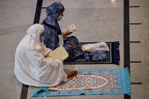 | Des femmes portant des masques prient à la mosquée Al Makmur de Banda Aceh en Indonésie, le 24 avril 2020. |