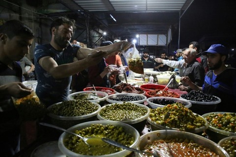 | Des Syriens achètent des olives dans un marché à la veille du ramadan, à Idleb, en Syrie, le 23 avril 2020. |