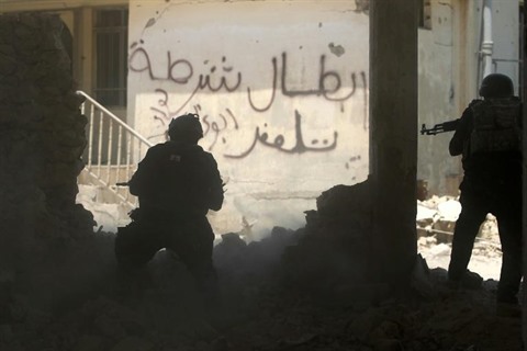 | Des forces irakiennes lors de l'offensive pour reprendre la Vieille ville de Mossoul aux jihadistes de l'EI, le 18 juin. |