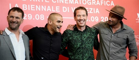 | Le réalisateur David Oelhoffen (1er à gauche), et les acteurs du film "Frères ennemis" à la Mostra de Venise, 1er septembre. |