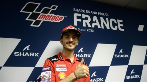 | Le pilote Ducati Francesco Bagnaia en pole du GP de France sur le circuit manceau de Bugatti, le 14 mai. |
