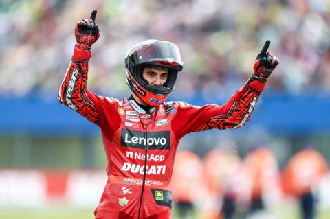 | Le pilote Ducati Francesco Bagnaia savoure son triomphe au GP moto des Pays-Bas sur le circuit d'Assen, le 26 juin. |