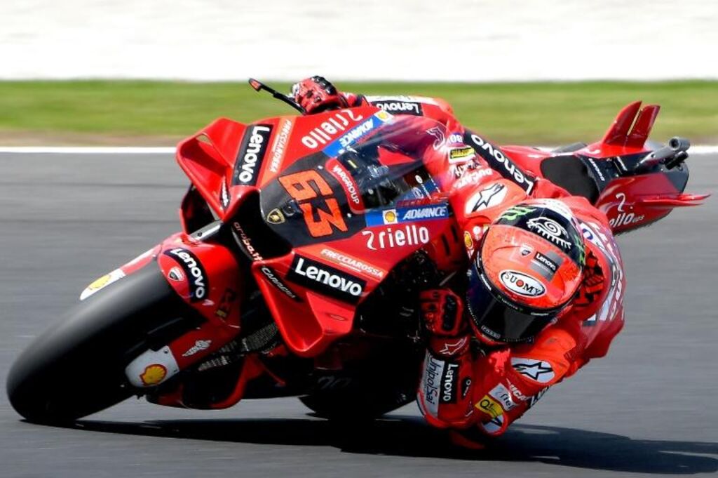 | Francesco Bagnaia, le pilote italien de Ducati, pendant la séance de qualification à Phillip Island, le 15 octobre, avant le Grand Prix MotoGP d'Australie. |