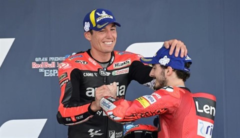 | L'Espagnol Aleix Espargaro (gauche) félicité sur le podium par l'Italien Francesco Bagnaia, vainqueur, le 1er mai à Jerez de la Frontera. |
