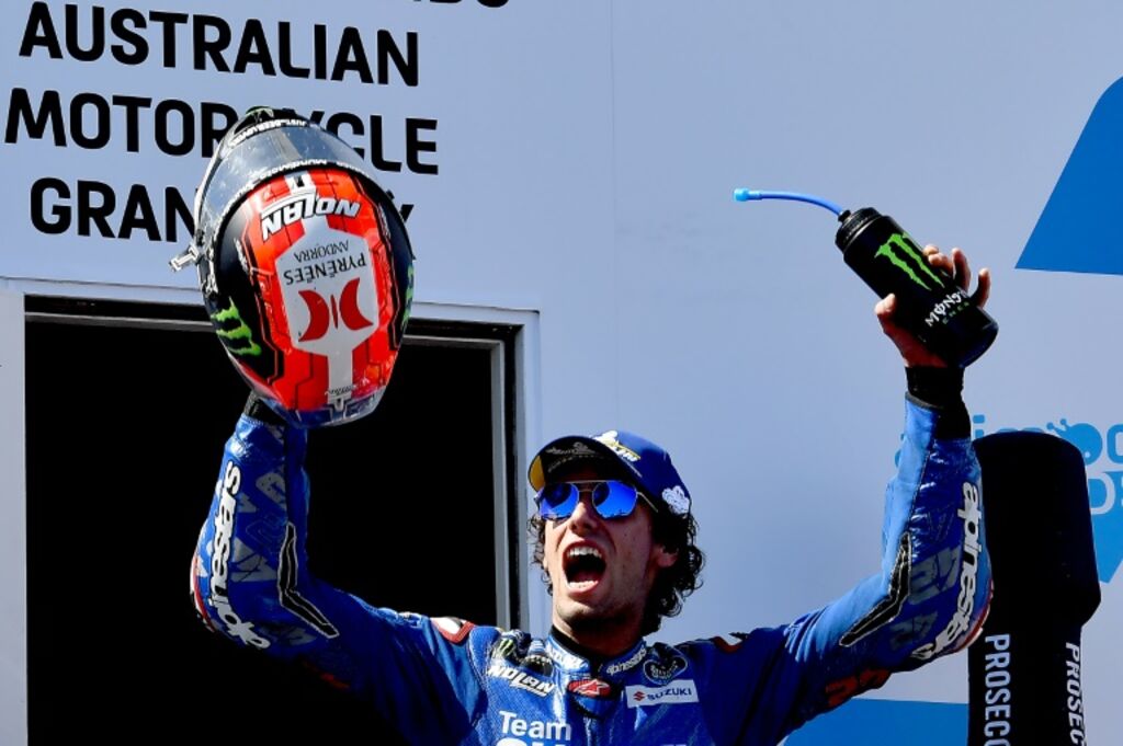 | Le pilote espagnol Alex Rins (Suzuki) après sa victoire au Grand Prix d'Australie de MotoGP, le 16 octobre à Phillip Island. |