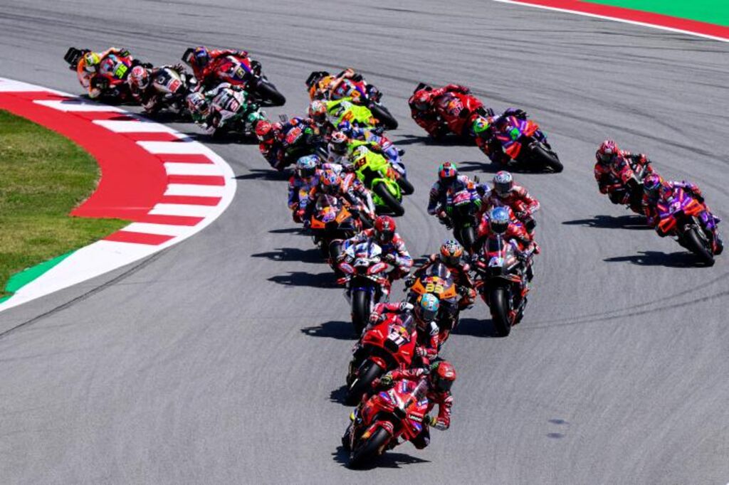 | Les pilotes lancés au départ du Grand Prix Moto de Catalogne à Montmeló, le 25 mai. |