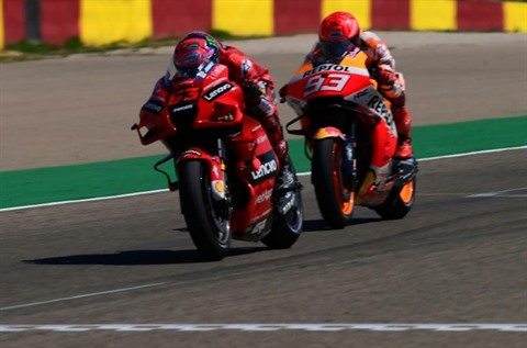 | Marc Marquez devancé par Francesco Bagnaia, vainqueur du GP d'Aragon sur le circuit Motorland, près d'Alcaniz, le 12 septembre. |