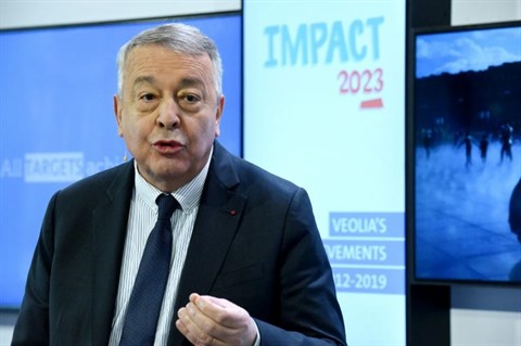 | Le Pdg de Veolia, Antoine Frérot, lors de la présentation des résultats 2019 du groupe et du plan stratégique "Impact 2023" à Aubervilliers, le 28 février. |