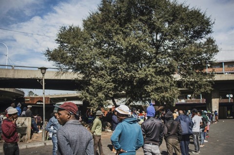 | File d'attente lors d'une distribution de nourriture au marché Kwa Mai Mai de Johnnesburg, le 13 avril. |