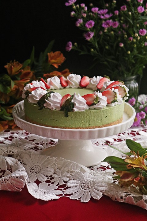 - Démouler et décorer la mousse avec la crème chantilly, les fraises ou le matcha en poudre.