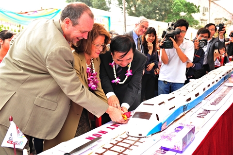 | Anissa Barrak coupe un gâteau de 20 m, cuisiné à l’occasion des activités qui étaient organisées dans le cadre de la Journée internationale de la Francophonie (20 mars), à l’Université de Hanoi, en 2013. |