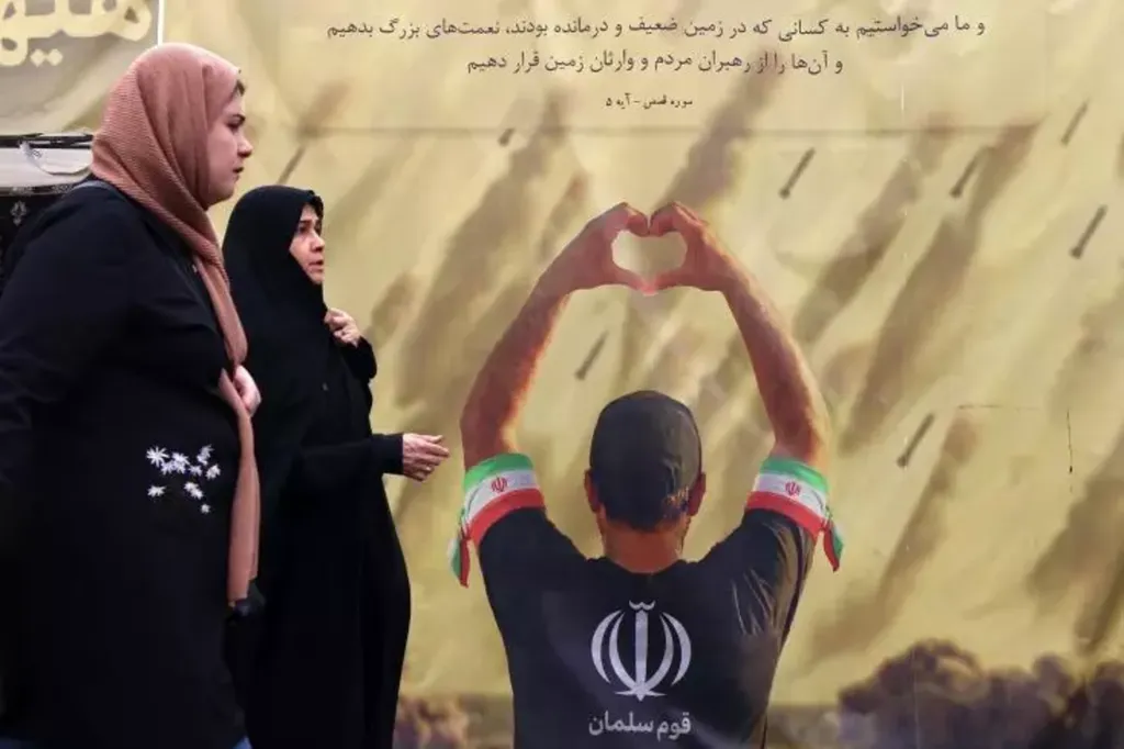| Des passantes marchent devant une peinture murale dans une rue de Téhéran, le 19 avril 2026. |