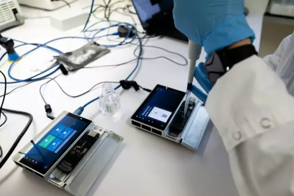 | Une ingénieure travaille sur un échantillon à la cellule d'intervention biologique d'urgence de l'Institut Pasteur à Paris. |