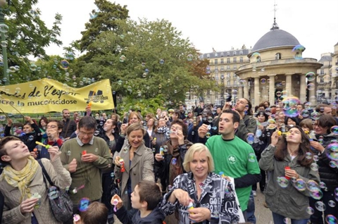 | Partie géante de bulles de savon, le 25 septembre 2010 à Paris, dans le cadre des Virades de l'espoir organisées en France au profit de la lutte contre la mucoviscidose. |