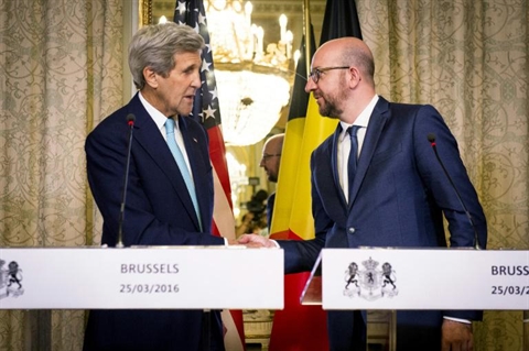 | Le secrétaire d'État américain John Kerry (gauche) et le ministre belge des Affaires étrangères Charles Michel, le 25 mars à Bruxelles |