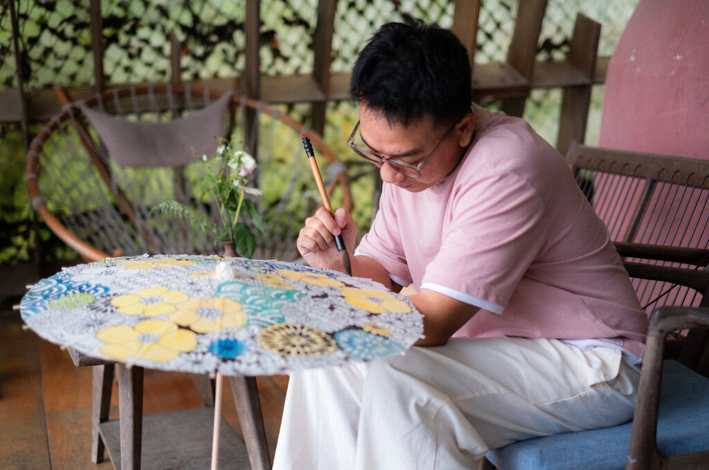 | Bùi Thanh Thuận peint sur une ombrelle. |