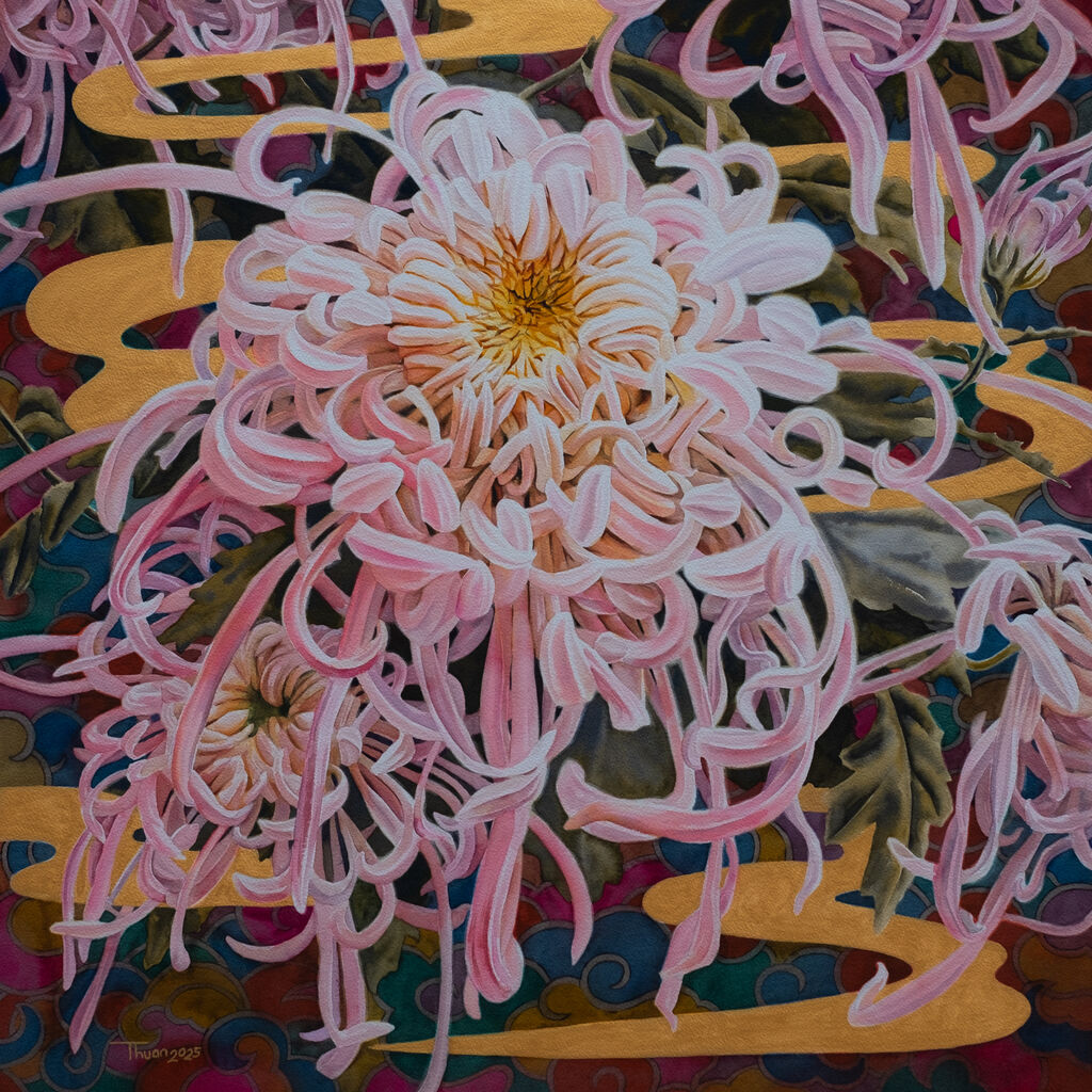 Dans "Murmures aux fleurs", une toile consacrée aux chrysanthèmes blancs - symboles de pureté et d’élégance dans la culture vietnamienne - incarne pleinement l’esthétique de l’artiste. Les fleurs, baignées de douceur, se détachent sur un arrière-plan inspiré de mosaïques en céramique, écho aux décors anciens de l’architecture vietnamienne. Des nuages dorés stylisés, rappelant l’imagerie laquée traditionnelle, confèrent à l’ensemble une profondeur nouvelle et un sentiment d’élévation.