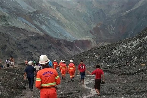 | Les pompiers birmans de sauveteurs sur les lieux d'un glissement de terrain dans le Nord de la Birmanie, le 2 juillet. |