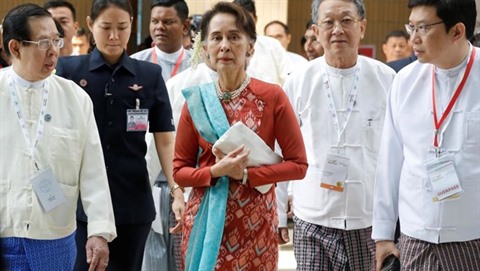 | Aung San Suu Kyi (centre) veut faire revenir les investisseurs au Myanmar. |