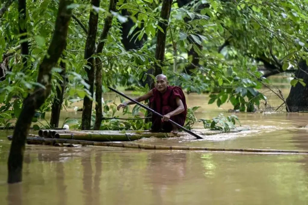 | Un moine bouddhiste utilise un radeau de bambou au milieu des inondations à Taungoo, dans la région de Bago, au Myanmar, le 14 septembre. |