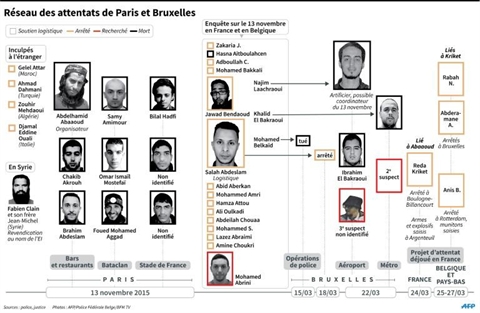 Les attentats de Paris et Bruxelles ont été revendiqués par le groupe jihadiste État islamique (EI), et les réseaux qui les ont commis s'imbriquent en un seul.