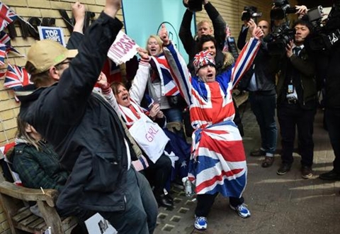 | Explosion de joie devant l'hôpital St Mary à l'annonce de la naissance royale le 2 mai à Londres. |