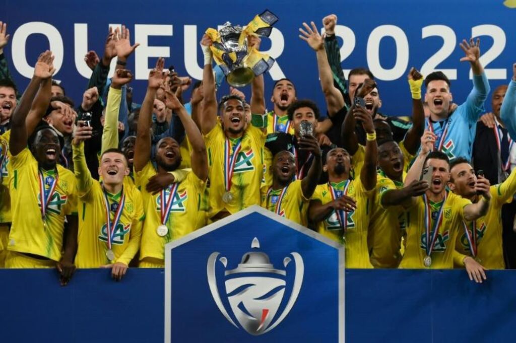 | Le Nantais Ludovic Blas brandit la Coupe de France après la victoire des Canaris en finale contre Nice au Stade de France la saison dernière, le 7 mai 2022. |