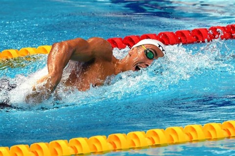 | Le Français Jordan Pothain, lors des séries du relais 4 x 200m nage libre aux Championnats d'Europe, le 19 mai à Budapest. |