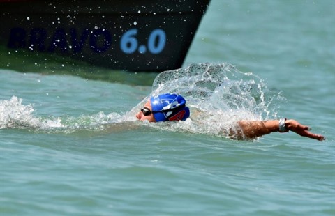| La Française Aurélie Muller lors du 5 km en eau Libreaux Mondiaux de natation à Balatonfüred en Hongrie. |