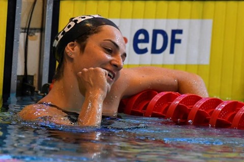 | La Française Beryl Gastaldello, heureuse après sa victoire dans le 100m nage libre aux Championnats de France, le 17 avril 2019 à Rennes. |