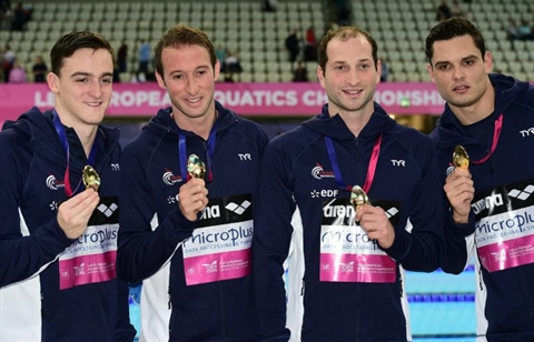 | Les Français William Meynard, Fabien Gilot, Clément Mignon et Florent Manaudou, médaillés d'or sur 4 x 100 m à l'Euro, le 16 mai à Londres |