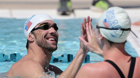 | Les nageurs américains Michael Phelps (gauche) et Allison Schmitt, lors d'une séance d'entraînement à Mesa, le 24 avril 2014. |
