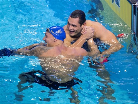 | L'Américain Caelab Dressel (gauche) de l'équipe Cali Condors célèbre sa victoire au 50m nage libre avec le Français Florent Manaudou (Energy Standard), arrivé deuxième, le 21 décembre, |
