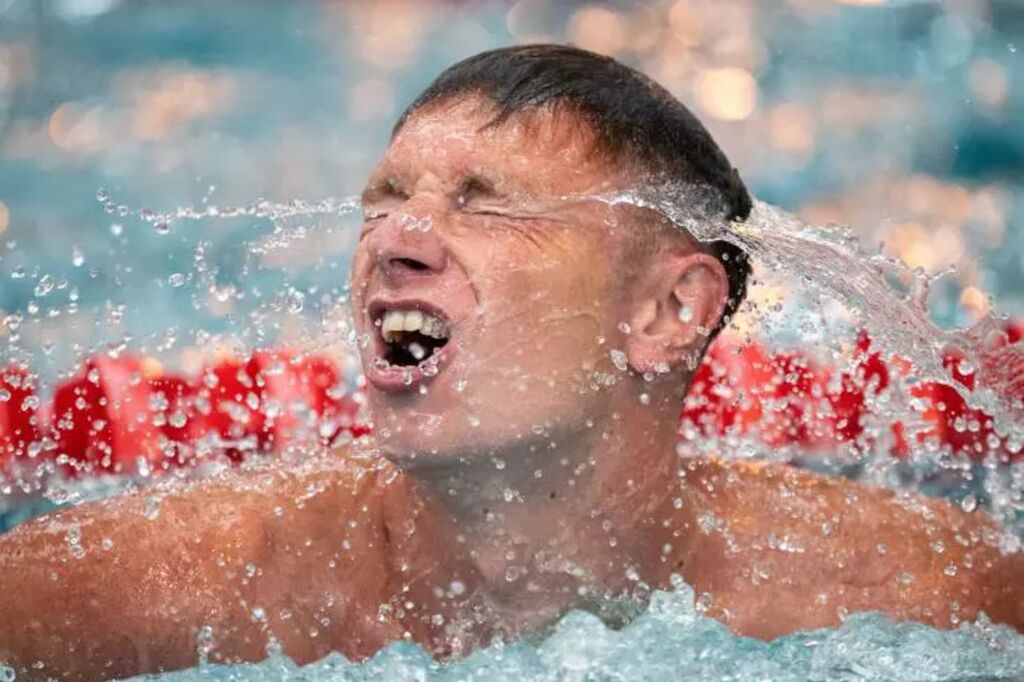 | David Aubry lors du 400 m libre des Championnats de France, lui assurant la qualification pour les Jeux de Paris, le 16 juin à Chartres. |