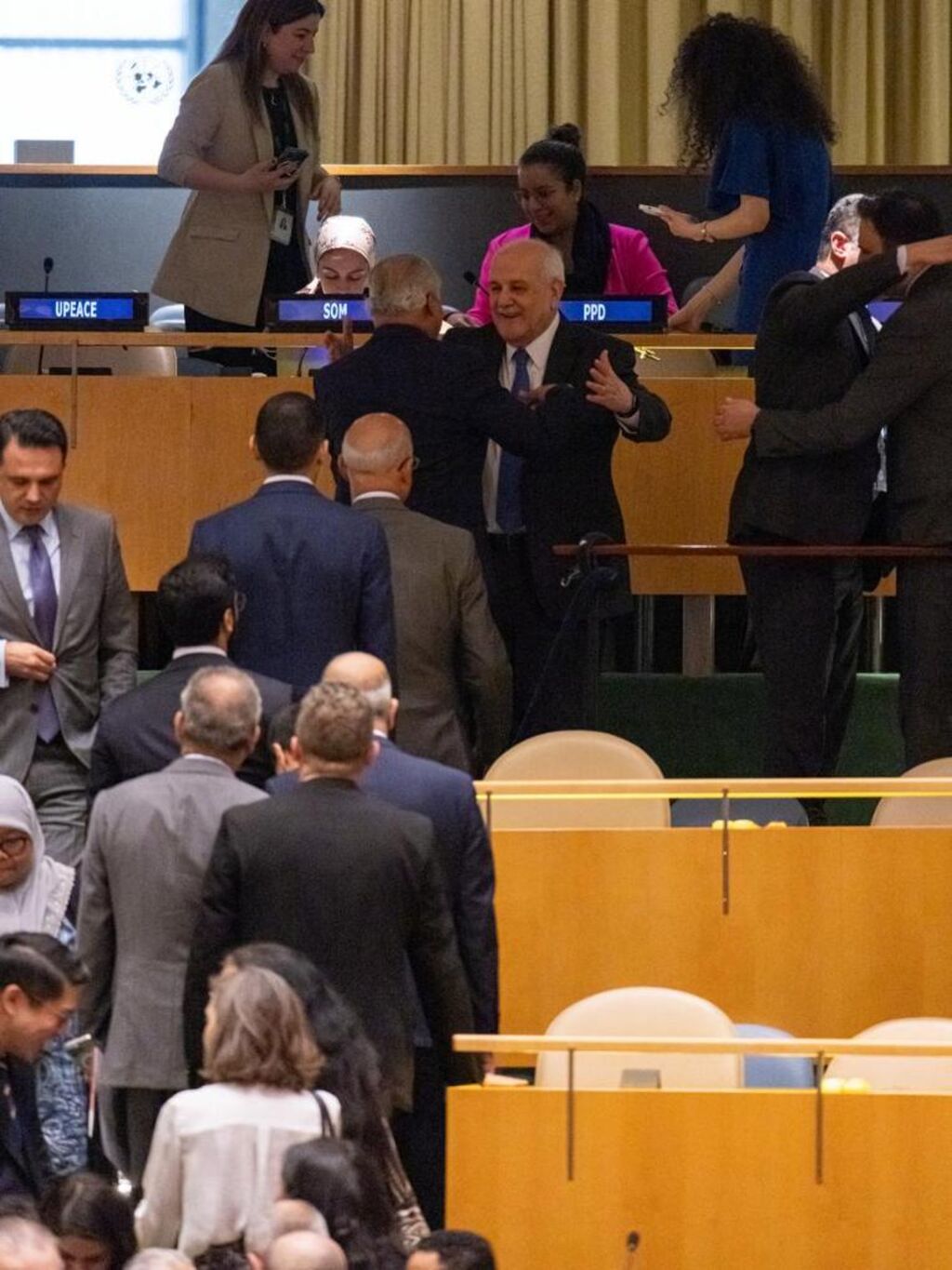 | Riyad Mansour, l'observateur permanent de la Palestine auprès des Nations unies, est salué après l'adoption d'une résolution par l'Assemblée générale au siège des Nations unies à New York, le 10 mai 2024. |