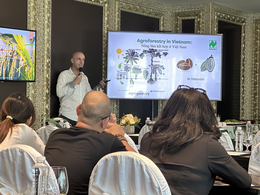 | Albin Deforges, représentant de Naturland Vietnam, a souligné lors du colloque la tendance irréversible de la production bio au Vietnam et en Europe. |