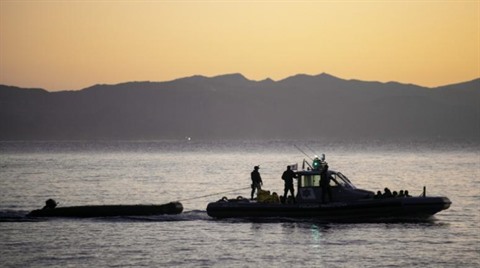 | Un bateau de garde-côtes tracte un bateau pneumatique utilisé par des migrants pour rejoindre la Grèce, en 2019. |