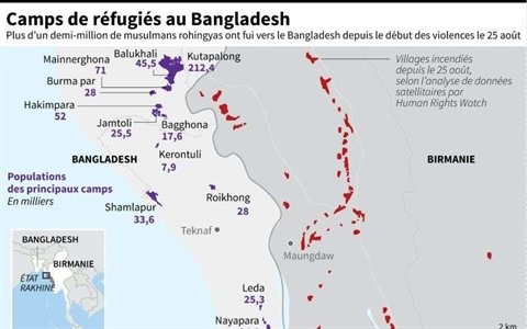| Carte localisant les camps de réfugiés Rohingyas les plus importants au Bangladesh à la frontière avec la Birmanie. |