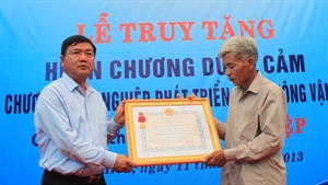 | Le ministre des Communications et des Transports, Dinh La Thang (gauche), remet l’Ordre du Courage à Trân Huu Trong, père du jeune Trân Huu Hiêp. |