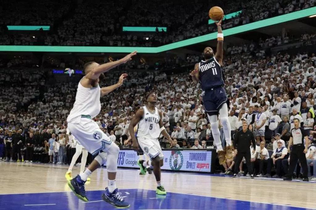 | Kyrie Irving (droite) vole au-dessus de la défense des Wolves, lors de la victoire des Dallas Mavericks sur le parquet des Minnesota Timberwolves, le 22 mai. |