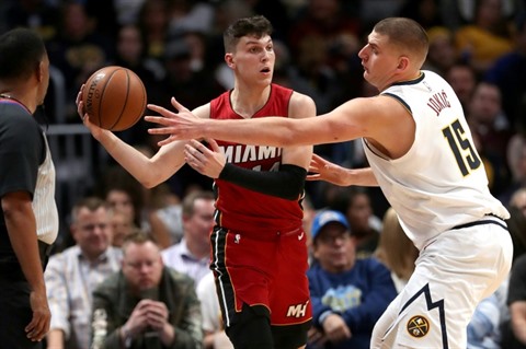 | Tyler Herro (gauche) du Miami Heat à la lutte avec Nikola Jokic des Denver Nuggets, en NBA, le 5 novembre à Denver. |