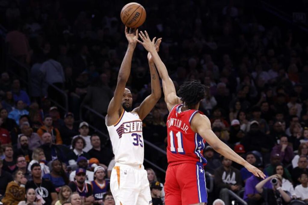 | Kevin Durant, l'ailier fort des Phoenix Suns, tire devant Jeff Dowtin Jr., le meneur des Philadelphia Sixers, pendant une rencontre de saison régulière de la NBA. |