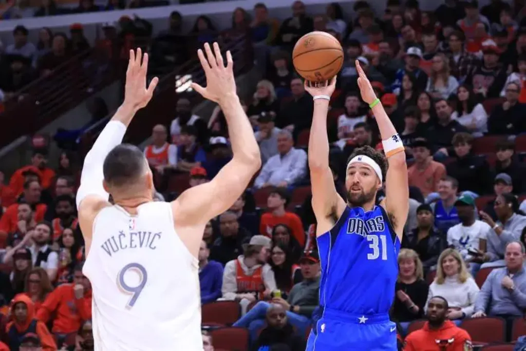 | Klay Thompson, l'arrière des Dallas Mavericks, prend un tir devant Nikola Vucevic, le pivot monténégrin des Chicago Bulls, lors d'un match de saison régulière de NBA, à Chicago, le 29 mars 2025. |