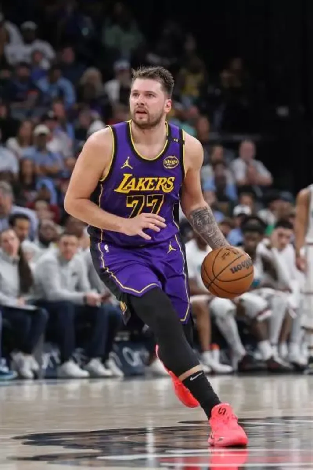 | Luka Doncic, le meneur slovène des Los Angeles Lakers, pendant la première mi-temps d'un match de NBA contre les Memphis Grizzlies, à Memphis, le 29 mars 2025. |