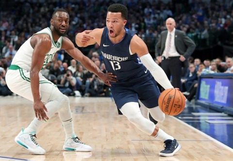 | Kemba Walker des Boston Celtics (gauche) lors du match de NBA face aux Mavericks, à Dallas, le 18 décembre. |