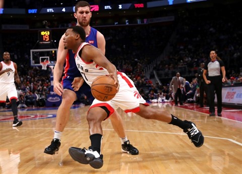 | Kyle Lowry (droite) des Toronto Raptors contourne Sviatoslav Mykhailiuk des Pistons lors du match de NBA à Detroit, le 18 décembre. |