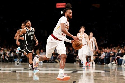 | Darius Garland des Cleveland Cavaliers contre les Brooklyn Nets en barrage NBA, le 12 avril à Brooklyn. |