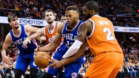 | Richaun Holmes (22) des Philadelphia 76ers tente de dribbler devant Kyrie Irving (2) des Cleveland Cavaliers, le 31 mars 2017 à Cleveland. |