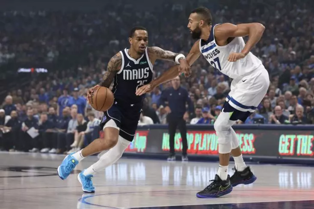 | P.J. Washington (gauche), des Dallas Mavericks, face à Rudy Gobert (droite), des Minnesota Timberwolves, en finale de conférence NBA, le 26 mai à Dallas. |