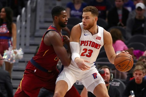 | Blake Griffin, des Detroit Pistons face à Tristan Thompson, N°13 de Cleveland, lors du match le 25 octobre à Detroit, Michigan. |